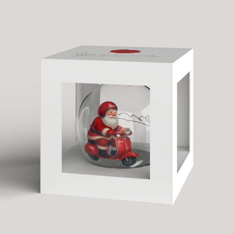 Lo spirito natalizio ha conquistato anche il mondo Vespa: questa pallina di Natale in vetro è la perfetta incarnazione della tradizione classica e del romanticismo delle feste, con Babbo Natale sulla sua Vespa rossa, pronto a dare vita alla magia del Natale.