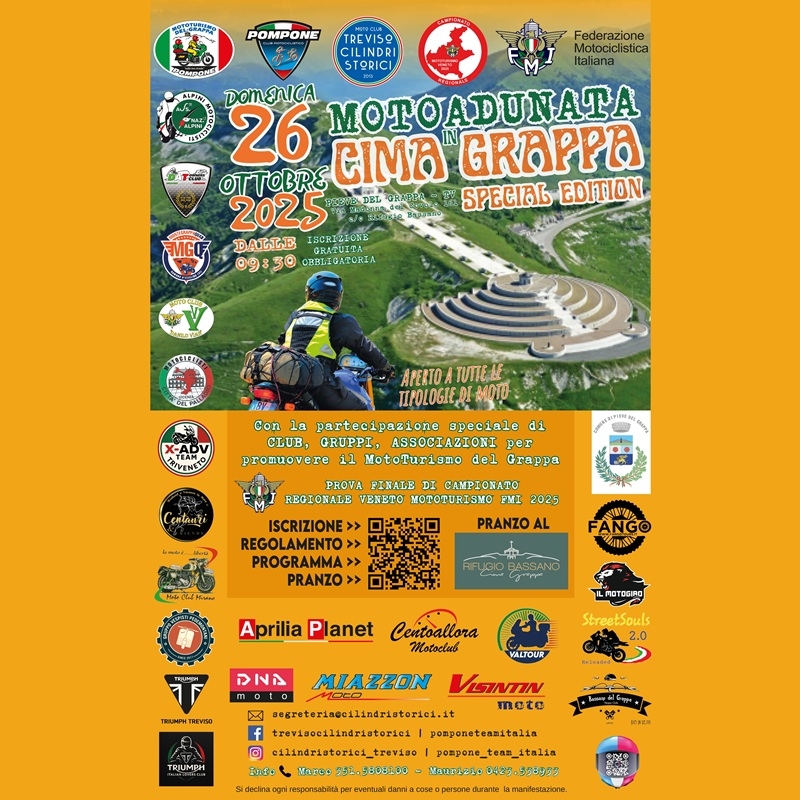 Domnica 26-10-2025 dalle 9.30 alle 17.00, il Moto Club TREVISO CILINDRI STORICI ASD organizza con il CLUB POMPONE e la FMI Federazione Motociclistica Italiana: