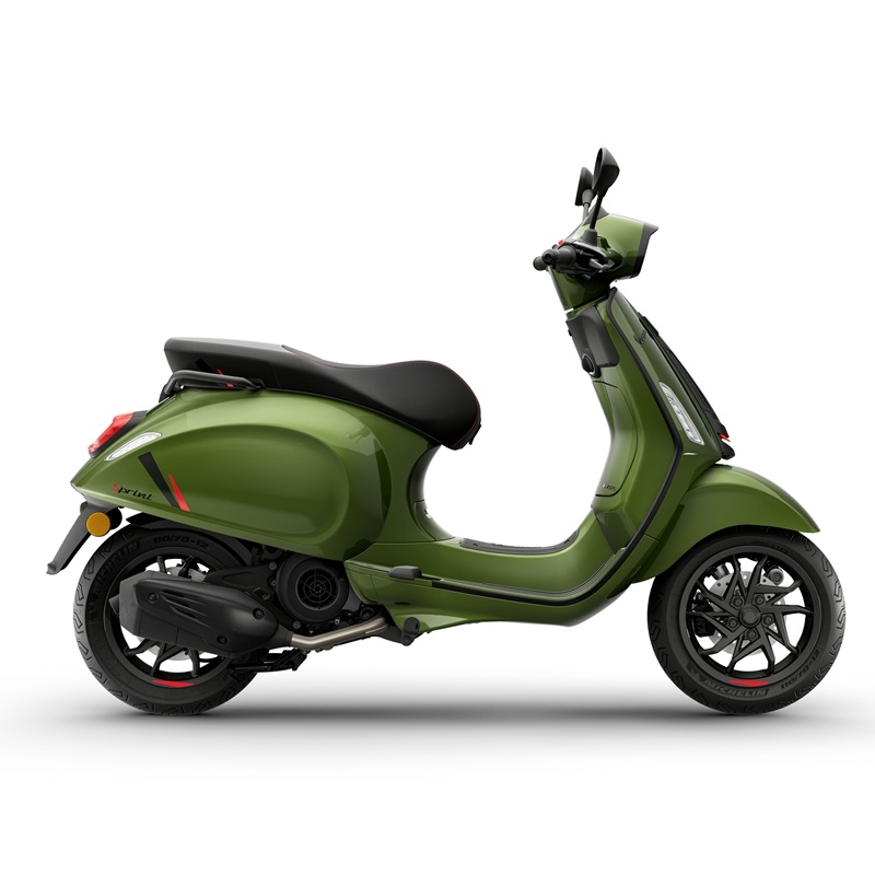 Vespa Sprint S è disponibile in cinque colorazioni: Bianco Innocente, Rosso Coraggioso, Blu Eclettico per le sole versioni con motorizzazione termica, e Nero Convinto opaco e la nuova cromia Verde Ribelle anche per le versioni elettriche. Tutte le tinte sono abbinate a grafiche dedicate e a grintosi dettagli neri, sia con finitura opaca, come ad esempio il tipico cravattino al centro dello scudo, sia lucida, come i cerchi.