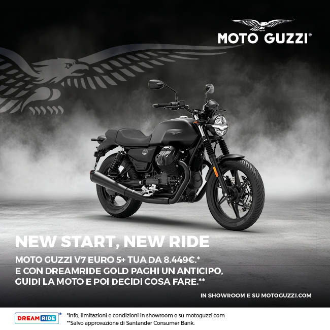 **Annuncio pubblicitario con finalità promozionale. Esempio di finanziamento: MOTO GUZZI V7 850 Stone Abs my25 Prezzo di listino € 9.199,00. Prezzo promo € 8.449,00, anticipo € 3.849,50; importo totale del credito € 4.199,50, da restituire in 23 rate mensili ognuna di € 0,00, ed un VFG pari alla maxi rata finale di € 4.599,50, importo totale dovuto dal consumatore € 4.703,99. TAN 0,00 % (tasso fisso) - TAEG 4,90 % (tasso fisso). Spese comprese nel costo totale del credito: interessi € 0,00, istruttoria € 400,00, incasso rata € 3,75 cad. a mezzoSDD, produzione e invio lettera conferma contratto € 1.00; comunicazione periodica annuale € 1,00 cad.; imposta sostitutiva (o imposta di bollo): € 11,49. Offerta valida presso i dealers aderenti, fino al 31/01/2026. Condizioni contrattuali ed economiche in "Informazioni Europee di Base sul Credito ai Consumatori" presso la rete di vendita e sul sito www.santanderconsumer.it, sez. Trasparenza. Salvo approvazione di Santander Consumer Bank