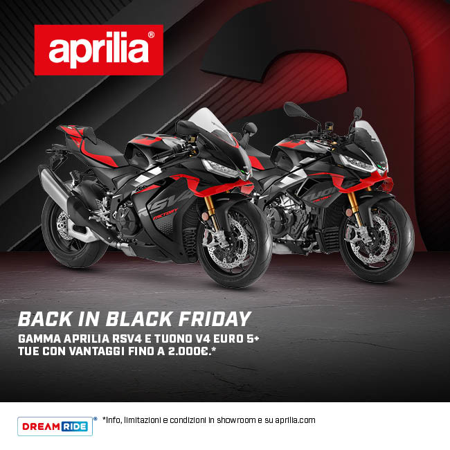 *Offerta valida sul prezzo di listino consigliato franco concessionario per veicoli immatricolati dal 01/11/2025 al 30/11/2025 presso la rete di vendita ufficiale Aprilia che aderisce all’iniziativa. La promozione prevede i seguenti vantaggi: 2.000€ su RSV4 Factory Euro 5+, 1.500€ su RSV4 e Tuono V4 Factory, 1.000€ su Tuono V4 Euro 5+ riconosciuti attraverso varie possibilità, anche combinate tra loro, come ad esempio sconto sull’acquisto di accessori, abbuono delle spese di immatricolazione, assicurazione compresa nel prezzo f.c consigliato del veicolo, contributo sul prezzo f.c consigliato di Aprilia RSV4 e Tuono V4 Euro5+. Non cumulabile con eventuali ulteriori promozioni proposte dal concessionario.
