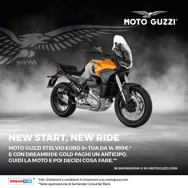 ***Annuncio pubblicitario con finalità promozionale. Esempio di finanziamento: MOTO GUZZI Stelvio 1042 PFF Rider Assistance Solution Abs Prezzo di listino € 17.299,00. Prezzo promo € 15.799,00, anticipo € 7.149,50; importo totale del credito € 8.249,50, da restituire in 23 rate mensili ognuna di € 0,00, ed un VFG pari alla maxi rata finale di € 8.649,50, importo totale dovuto dal consumatore € 8.764,12. TAN 0,00 % (tasso fisso) - TAEG 2,59 % (tasso fisso). Spese comprese nel costo totale del credito: interessi € 0,00, istruttoria € 400,00, incasso rata € 3,75 cad. a mezzoSDD, produzione e invio lettera conferma contratto € 1.00; comunicazione periodica annuale € 1,00 cad.; imposta sostitutiva (o imposta di bollo): € 21,62. Offerta valida presso i dealers aderenti, fino al 31/01/2026. Condizioni contrattuali ed economiche in "Informazioni Europee di Base sul Credito ai Consumatori" presso la rete di vendita e sul sito www.santanderconsumer.it, sez. Trasparenza. Salvo approvazione di Santander Consumer Bank.