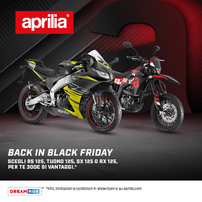 *Offerta valida sul prezzo di listino consigliato franco concessionario per veicoli immatricolati dal 01/11/2025 al 30/11/2025 presso la rete di vendita ufficiale Aprilia che aderisce all’iniziativa. La promozione prevede 300€ di vantaggi riconosciuti attraverso varie possibilità, anche combinate tra loro, come ad esempio sconto sull’acquisto di accessori, abbuono delle spese di immatricolazione, assicurazione compresa nel prezzo f.c consigliato del veicolo, contributo sul prezzo f.c consigliato di RS 125, Tuono 125, SX 125 e RX 125 Euro 5+. Non cumulabile con eventuali ulteriori promozioni proposte dal concessionario.