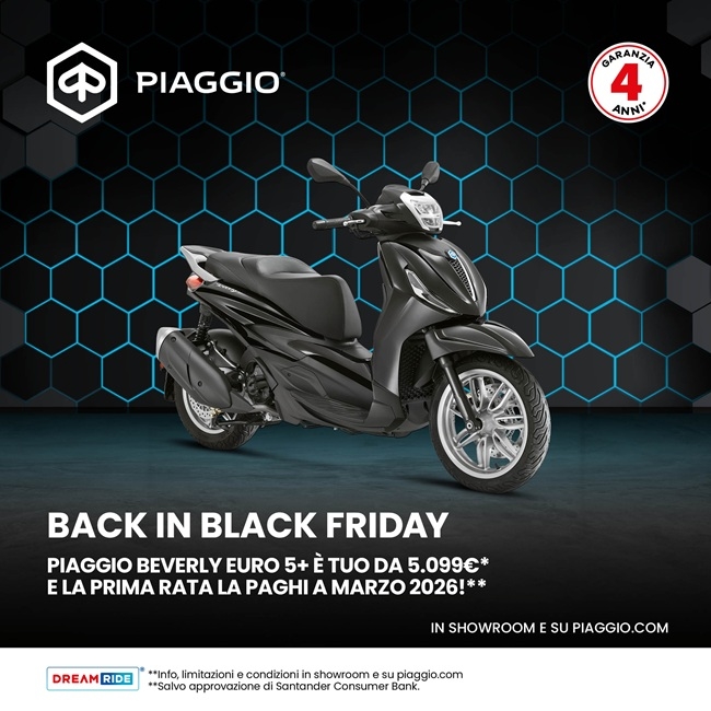 In più Piaggio Beverly è tuo in 24 mesi senza interessi (TAN 0,00%, TAEG 8,51%) e la prima rata da 199€ la paghi a Marzo 2026!**