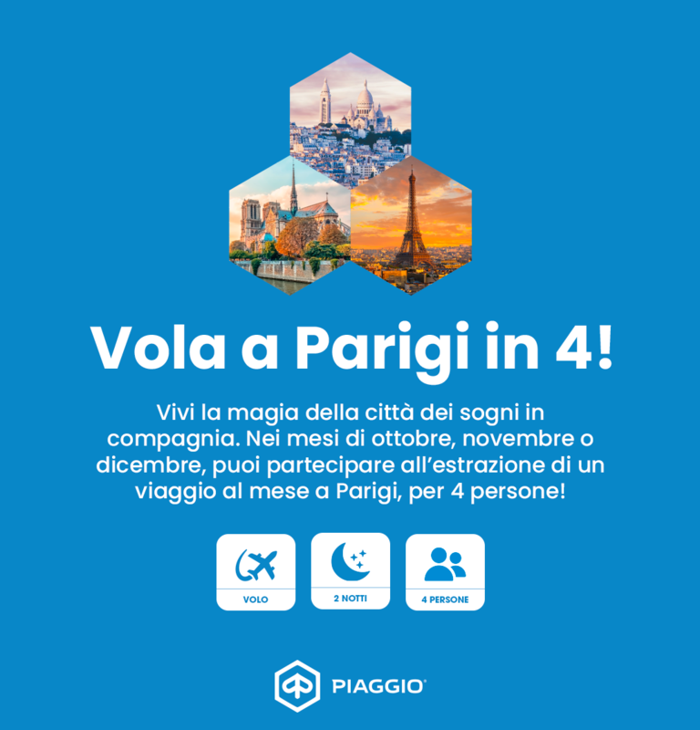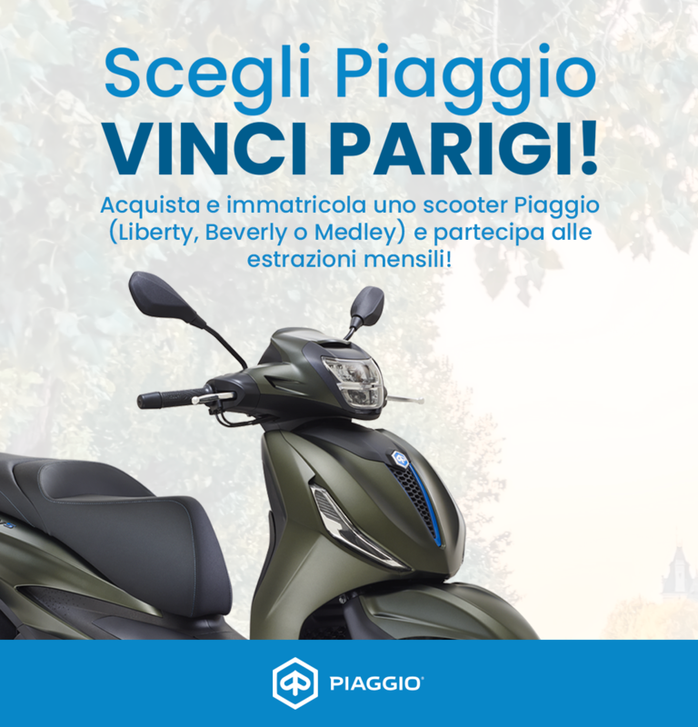 Scegli il tuo nuovo scooter tra i modelli Liberty, Medley o Beverly e partecipa all'estrazione di un viaggio al mese a Parigi per 4 persone. Potrai vincere anche un casco Piaggio al giorno tra quelli messi in palio.
