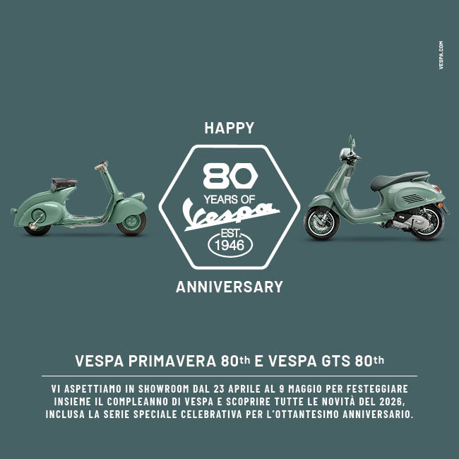 Un universo di progetti è stato pensato per onorare il traguardo, parziale, di questi 80 anni. Dalla nuova Vespa 80th, raffinato richiamo alle origini, ai capi e accessori del drop “80TH ANNIVERSARY” che riflettono la filosofia e lo stile di Vespa, a coronare un viaggio che proprio come Vespa, sfugge alle regole del tempo. Ottanta anni di storie di tanta gente comune, anche se in sella ad una Vespa nessuno si sente “comune”. Ottanta anni di forme iconiche,avventure e gioia di vivere, questa è l’anima di Vespa, che non si fa imprigionare dal passato ma, come ha sempre fatto, si proietta nel futuro.