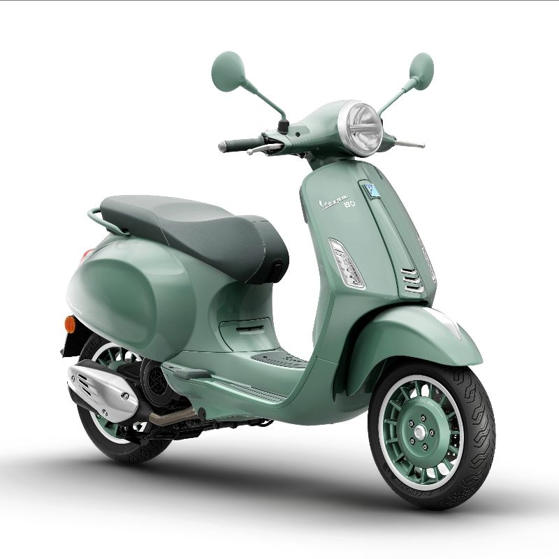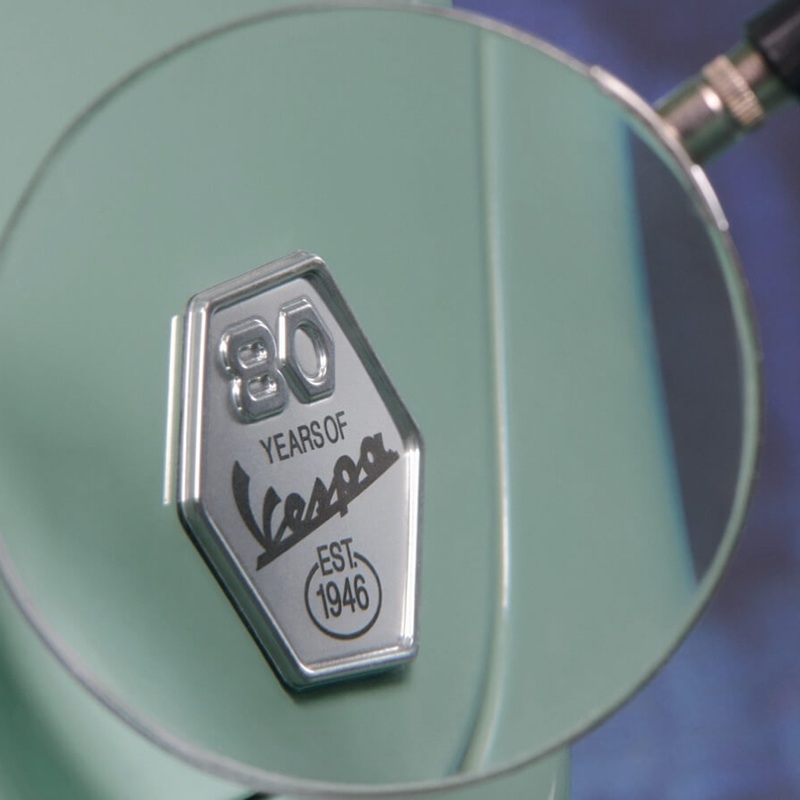 Completano il design elementi tono su tono in verde più profondo: la sella dalle cuciture artigianali, gli inserti in gomma sulla pedana, la cover del retroscudo e le manopole, in un insieme coerente e materico. I cerchi evocano le geometrie chiuse dei modelli storici, ispirandosi alla Vespa 98 del 1946, e riportano la scritta “Est. 1946” con finitura diamantata sul canale. Sulla Primavera 80th compare anche una griglia laterale che richiama le soluzioni tecniche delle origini. Sullo scudo sono presenti la targhetta celebrativa “80th” e il badge “80 years of Vespa Est. 1946”, segnano con discrezione l’appartenenza a una storia che continua.