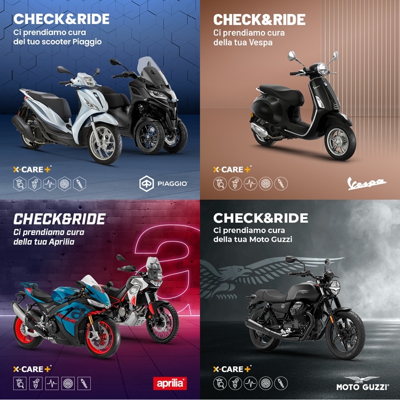 Con Check&Ride ci prendiamo cura della tua Aprilia, della tua Moto Guzzi, della tua Vespa e del tuo scooter Piaggio: l’iniziativa ufficiale della Rete di Assistenza Autorizzata dedicata alla manutenzione del tuo veicolo, pensata per garantirti prestazioni ottimali e la massima sicurezza su strada. Grazie ai nostri tecnici specializzati, puoi effettuare un check up gratuito e, in caso di intervento, usufruire del 20% in meno sui ricambi originali, rispetto al prezzo di listino.